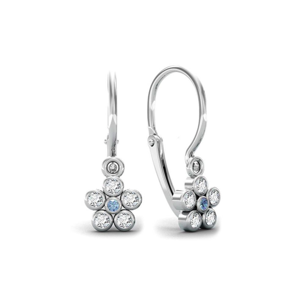 Jemné dětské náušnice MOISS z bílého zlata ve tvaru květiny s modrým zirkonem uprostřed a čirými kameny kolem rozzáří každý dětský úsměv.