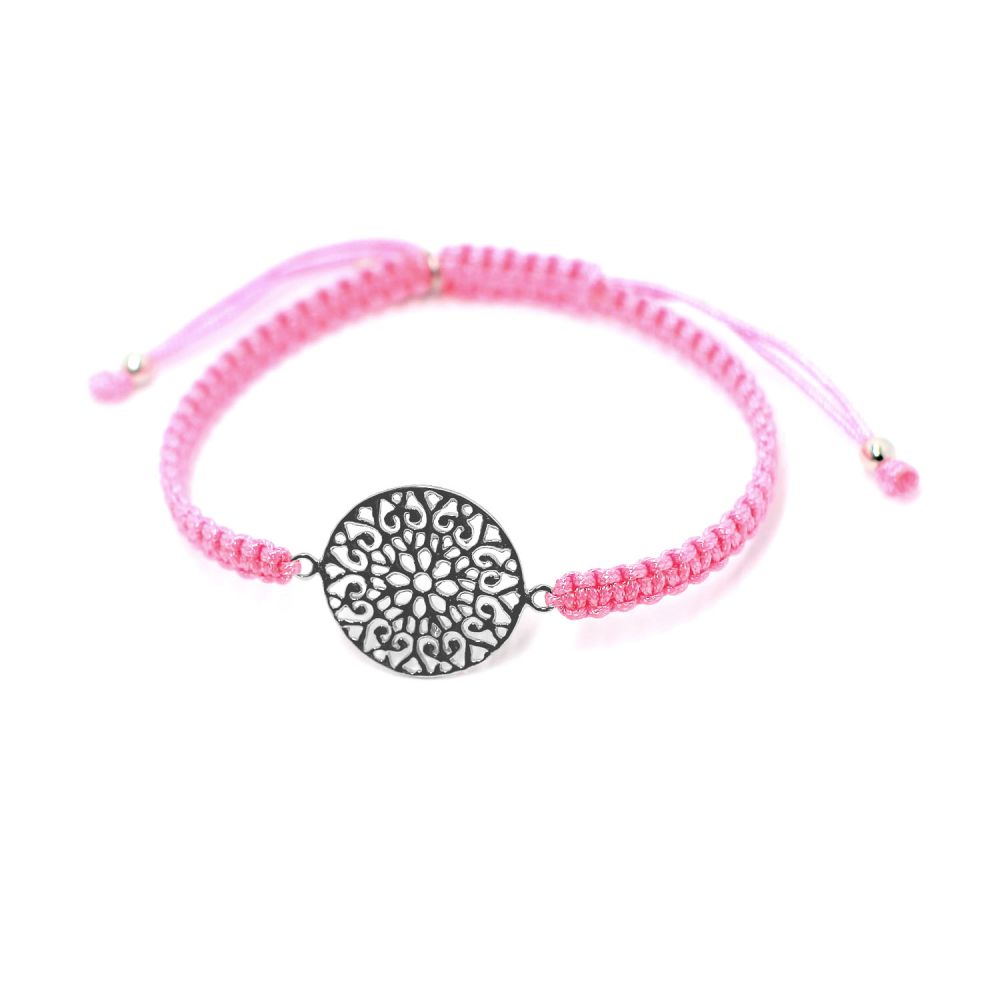 Jemný růžový provázkový náramek MOISS s motivem květiny vyzařuje ženskost, lehkost a pozitivní energii. Ideální doplněk pro každý den.