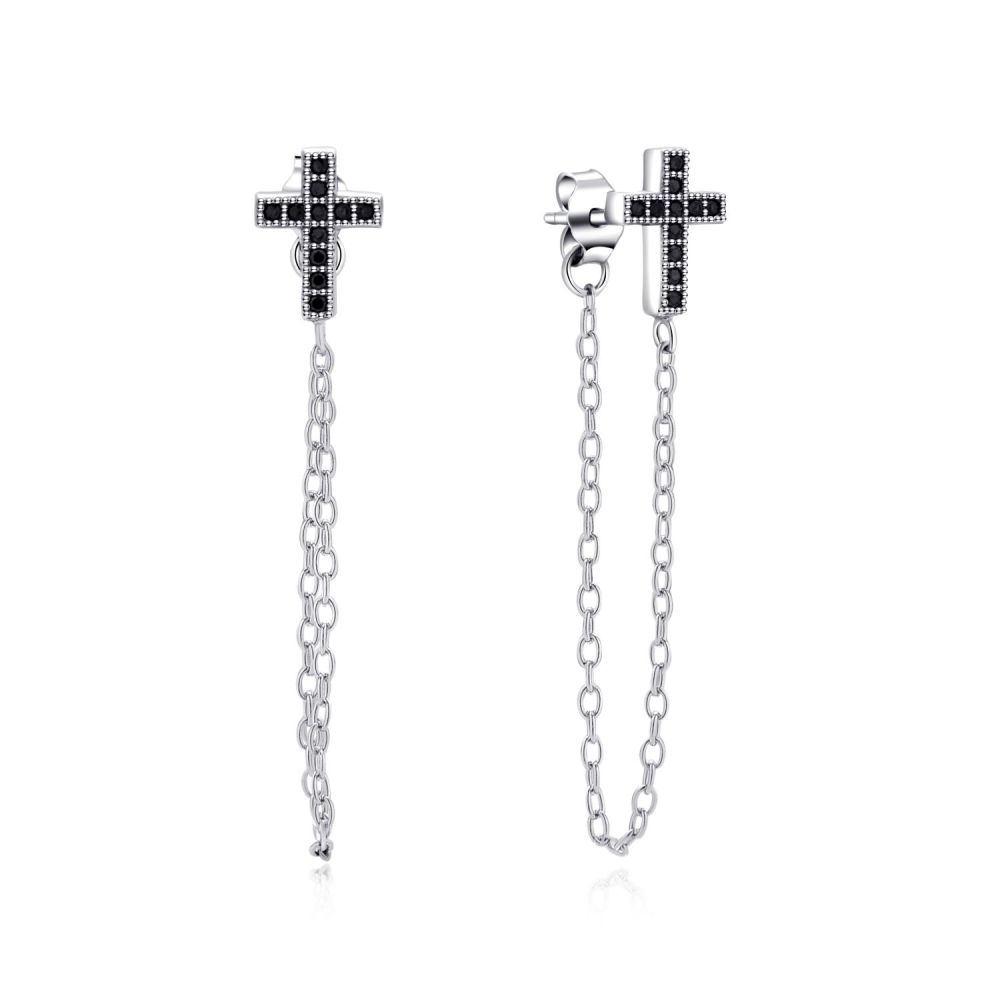Stříbrná náušnice MOISS KŘÍŽEK s černými kameny a řetízkem je výrazným šperkem s moderním a odvážným stylem.