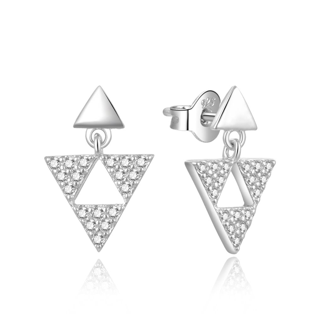 Stříbrné náušnice MOISS s motivem trojúhelníku a třpytivými kameny jsou moderním šperkem s geometrickým nádechem.
