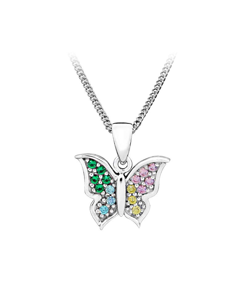 Stříbrný přívěsek MOISS MOTÝL s barevnými kameny je hravým a elegantním symbolem lehkosti a radosti.