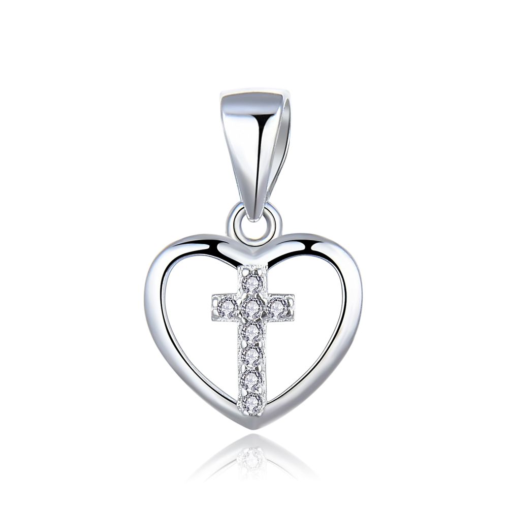 Stříbrný přívěsek MOISS ve tvaru srdce s křížkem ze zirkonů spojuje symbol lásky a víry v elegantním, jemně třpytivém provedení.